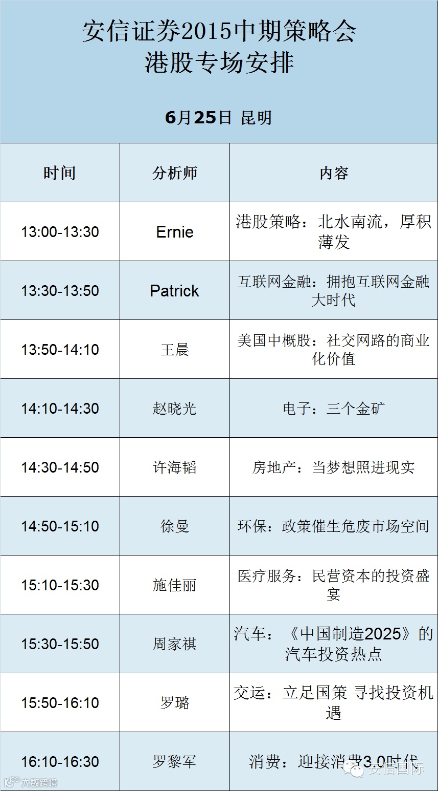 安信证券2015年中期策略会兹定于6月25日在昆明举办,特设港股专场,议程安排如下