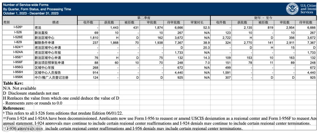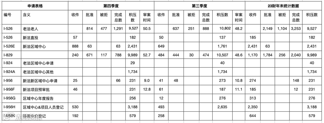 而对比此前数据,在2024财年的第一季度,也就是2023年10月至12月期间,移民局仅收到了32份直投I-526以及581份区域中心I-526E,合计613份,平均每月的申请量仅有204份。