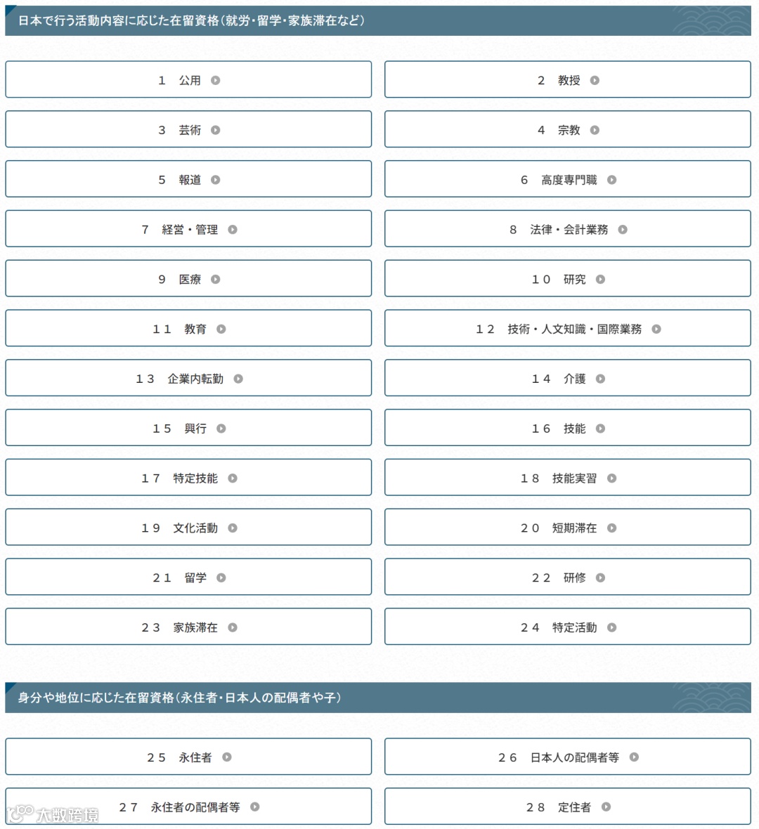 日本入管局官网一共列出了28种在留资格。