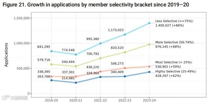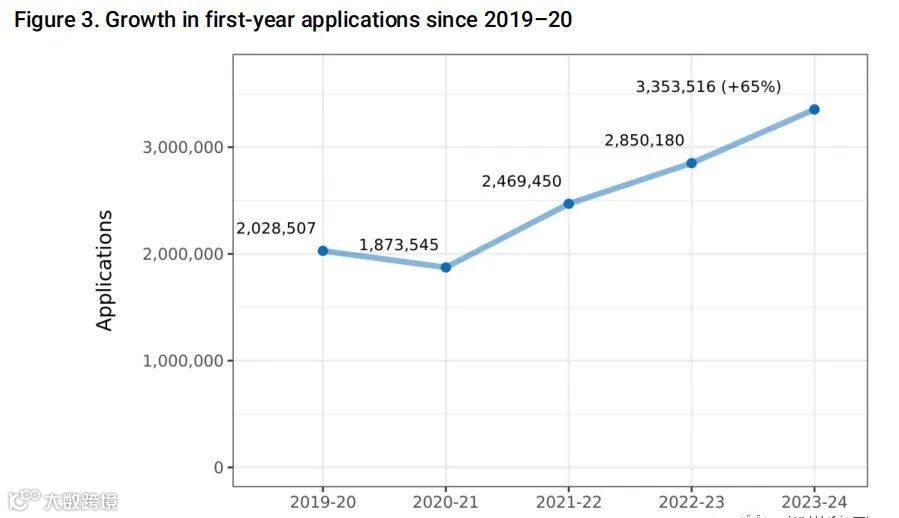 其次,实际提交美本早申的新生多达836,679人,美国大学的申请总量突破335万份,同比疫情前申请季分别暴涨了41%和65%。