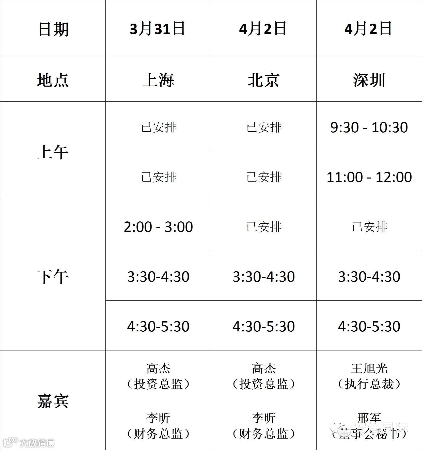 海昌控股高管将会分成两队进行三地路演,具体安排如下: