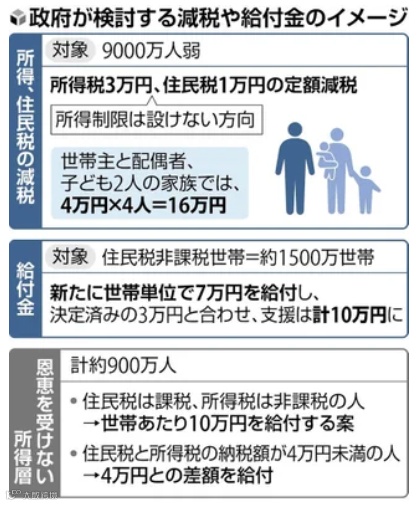 这些人一般是属于无法充分享受到4万日元定额减税,也领不到非课税家庭7万日元补助的群体(约有900万人)。