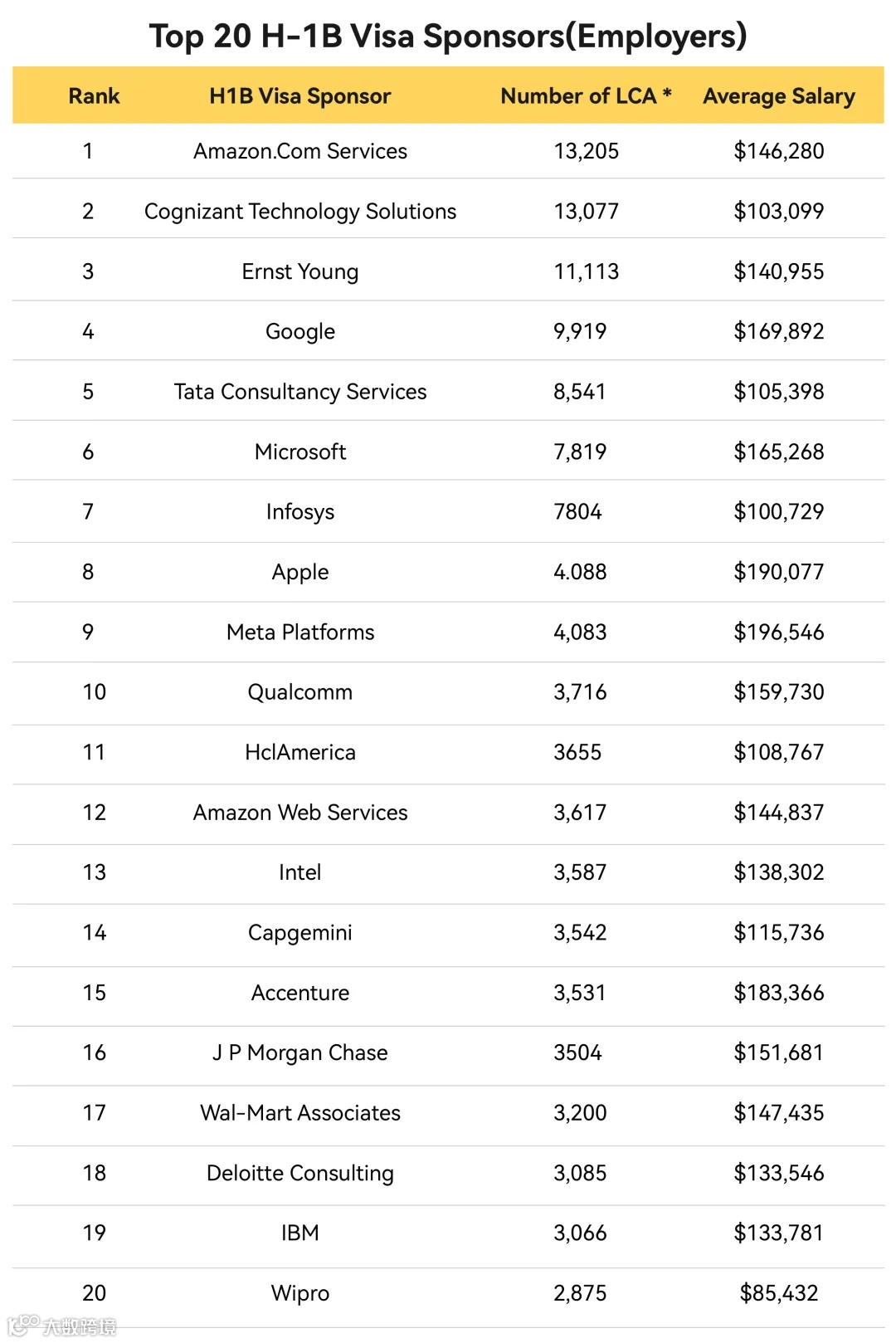从数据来看,担保H-1B最多的雇主大多是科技“大厂”,比如亚马逊、谷歌、微软、英特尔、苹果等,或者会计师事务所“四大”,比如安永、德勤等。