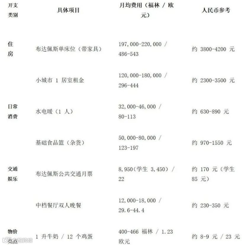 ·单身青年:每月仅需250,000-350,000 福林(约 616-863 欧元,人民币 4800-6800 元),就能覆盖房租、饮食、交通等基本开支。
