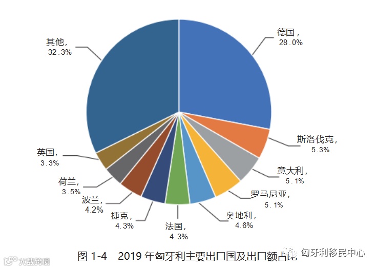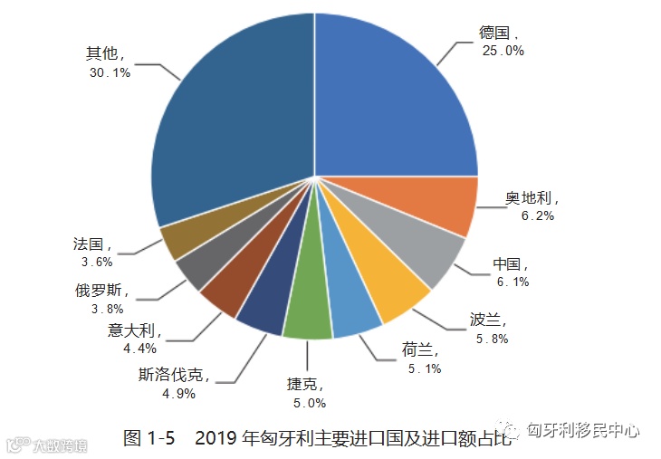 2019 年,匈牙利前五大出口国为德国、斯洛伐克、意大利、罗马尼亚、奥地利;前五大进口国为德国、奥地利、中国、波兰、荷兰。①