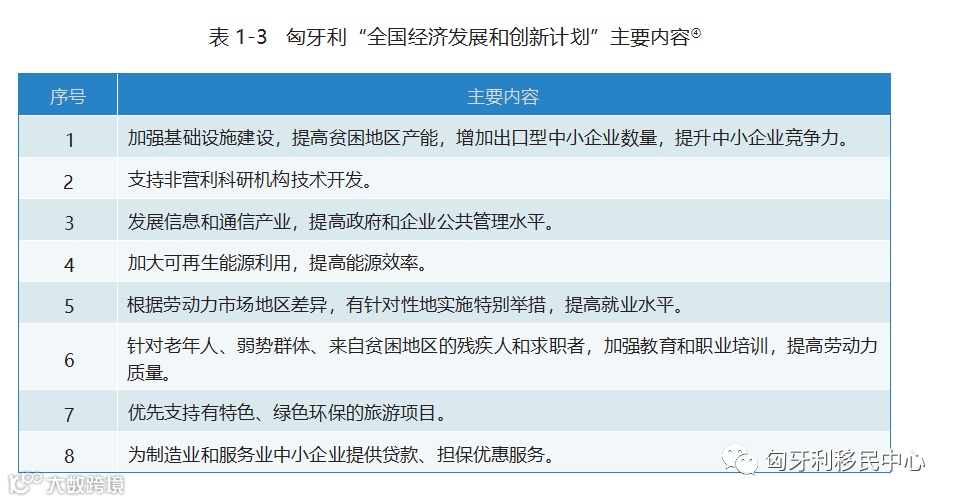 匈牙利国家经济部(2018 年大选后更名为财政部)于 2015 年 4 月发布“全国经济发 展 和 创 新 计 划(Economic De-velopmentand Innovation Operational Program,GINOP) ”,该计划旨在刺激匈牙利欠发达地区的经济发展,重点提高中小企业竞争力、促进研发创新力度、积极创造更多就业机会等。具体内容见表 1-3。