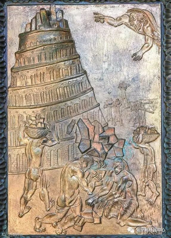 大教堂大门的铜质浮雕刻画了《圣经·旧约·创世纪》里巴别通天塔的故事,这个圣经故事试图解释世上为何会出现不同语言和种族。根据圣经的叙述,当时人类联合起来建造能通往天堂的高塔,上帝为了阻止这个计划赋予了人类不同的语言,使人类之间不能沟通,最终通天塔的计划失败,说着不同语言的人也自此各散东西。