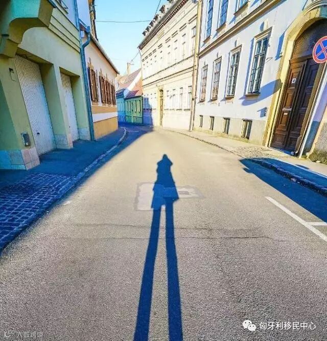 傍晚在广场附近的街巷里散步,夕阳拉长了身影,落在洒满金光的静谧的街道上。