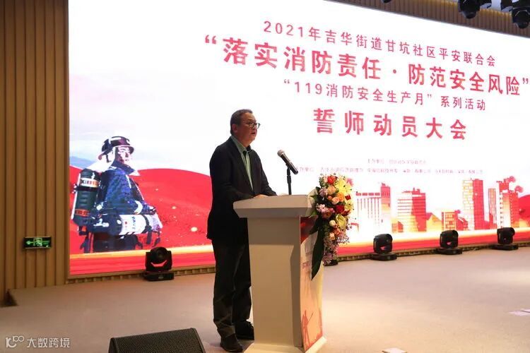 11月10日,吉华街道甘坑社区平安联合会“119消防安全宣传月”誓师动员大会在中海信(深圳)创新产业城召开。龙岗区武装部政委杨华同志,龙岗区应急管理局调研员高竞同志,吉华街道党工委副书记、办事处主任李红梅同志,党工委副书记、政法委员李天君同志,二级调研员、甘坑社区党委书记杨海民同志,龙岗区政协委员、中海信集团副总裁李莉同志以及吉华街道甘坑社区平安联合会各企业主要领导等出席活动。