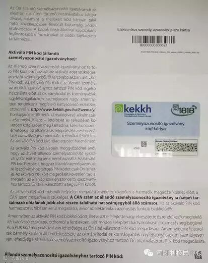 2、身份证激活码(Activation PIN Code):是一组五位数字,用来激活身份证,且只使用一次,只有激活的身份证才可以设置身份证密码,设置密码后才能具有电子使用功能。获得激活码有两种方式:客户在区政府当场设置;或者,客户也可以通过登陆KEKKH官网(www.kekkh.gov.hu/Eszemelyi),自己在网上设置激活码,前提是家里要有读卡设备,并在该网站上下载和安装读卡软件