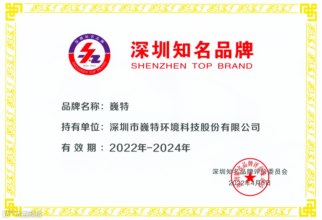 经过层层筛选和激烈角逐,企业申报、行业协会初审、秘书处受理及资格审查、市场评价、内部管理体系现场评审和品牌价值评估等环节,由深圳知名品牌评价委员会全体会议评选,巍特环境在众多申请企业中脱颖而出,与71家市场占有率高、诚信度高、知名度高的企业荣膺“深圳知名品牌”殊荣!