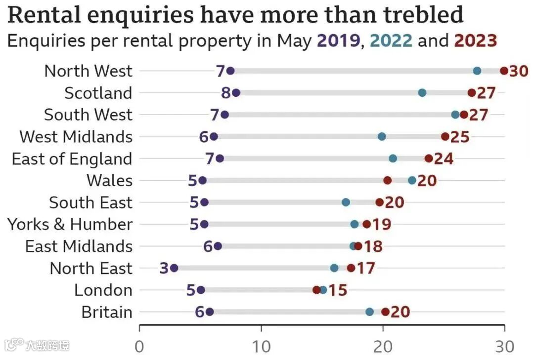根据BBC委托房地产门户网站Rightmove提供的最新数据,租房者之间的竞争非常激烈,每间租赁房产平均收到20个申请,而在2019年疫情之前,每间租赁房产平均仅收到6个申请。