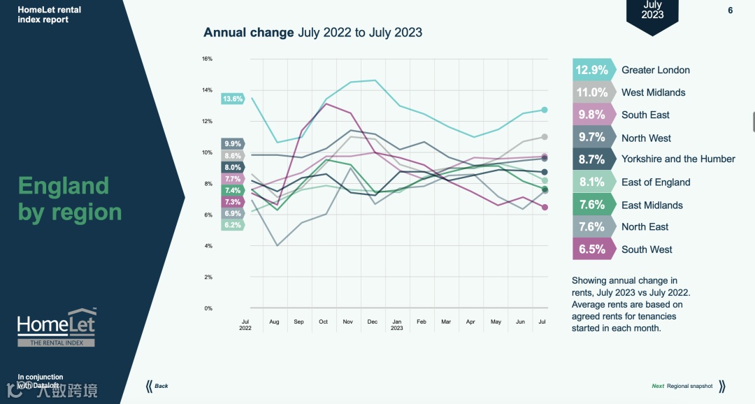 纵观英国各地区过去一年(2022年7月-2023年7月)的租金走势,对比英国其它地区,伦敦地区的租金年涨幅虽也有波动,但也一直保持在10%以上,并且领先其他地区。