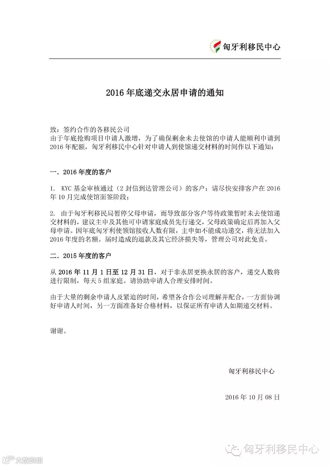 2. 由于匈牙利移民局暂停父母申请,而导致部分客户等待政策暂时未去使馆递 交材料的,建议主申及其他可请家庭成员先行递交,父母政策确定后再加入父 母申请 。因年底匈牙利使领馆接收人数有限,主申如不能成功递交,将无法加入如不能成功递交,将无法加入2016年度的名额。 届时造成的退款及其它经济损失等,管理公司对此免责。