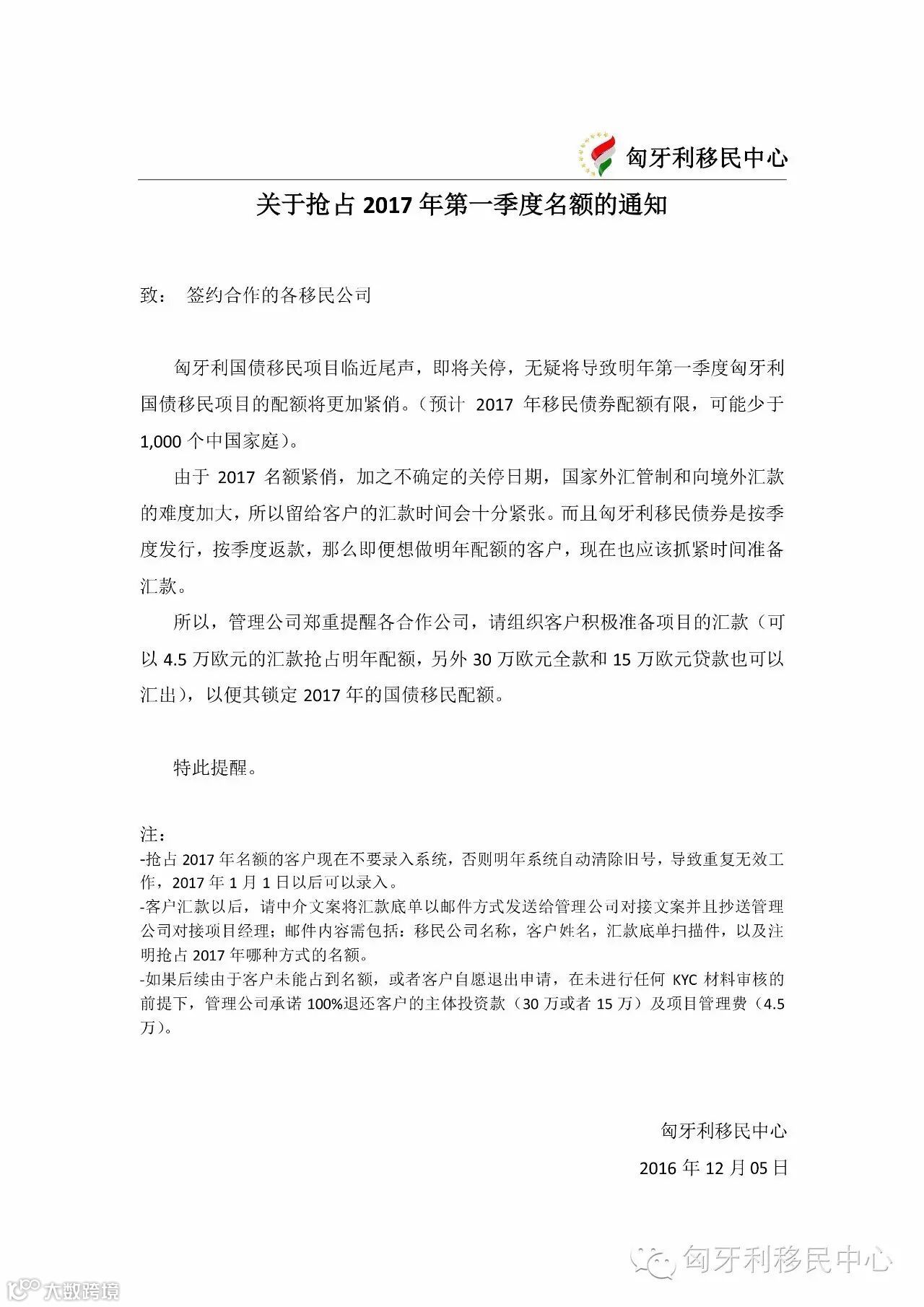 由于2017名额紧俏,加之不确定的关停日期,国家外汇管制和向境外汇款的难度加大,所以留给客户的汇款时间会十分紧张。而且匈牙利移民债券是按季度发行,按季度返款,那么即便想做明年配额的客户,现在也应该抓紧时间准备汇款。