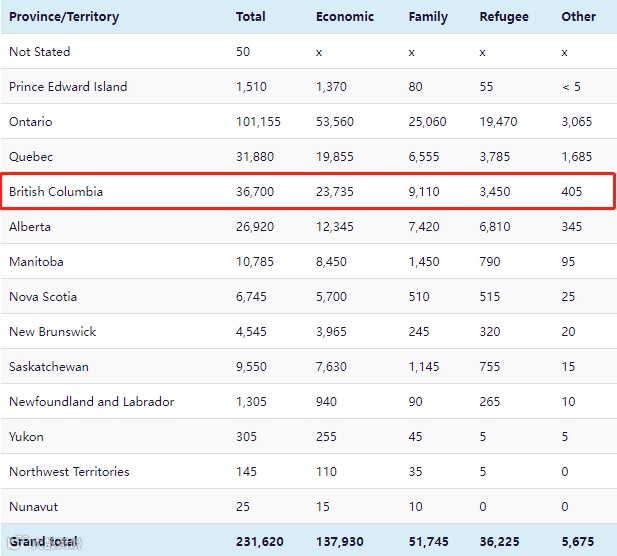 BC省经济类移民和家庭类移民排名第二,在其他移民中排名第三。