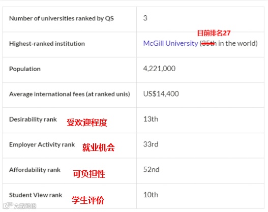 而在教育资源方面,蒙特利尔一共有3所知名大学上榜《QS世界大学排名》,分别是McGill大学(全球第27名),蒙特利尔大学(全球第111名),和康考迪亚大学(全球第521-530名)。