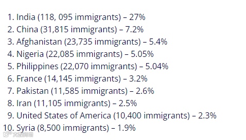 数据显示,加拿大在2022年共迎来了了31815名来自中国的永久居民,占总数的7.2%,位居加拿大移民十大来源国第二名!