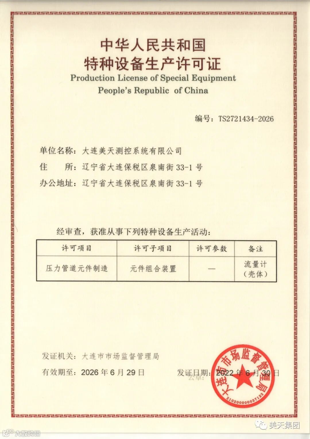 2022年6月30日,从大连市场监督管理局传来喜讯:公司顺利通过压力管道元件制造评审工作,获得大连市场监督管理局颁发的中华人民共和国特种设备生产许可证。
