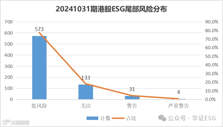 本期港股ESG评级尾部风险结果显示:被评为“低风险”的上市公司共有573家,占全部被评港股的77.3%;被评为“关注”的上市公司共有133家,占全部被评港股的17.9%;被评为“警告”和“严重警告”的上市公司共有35家,占全部被评港股的4.7%。