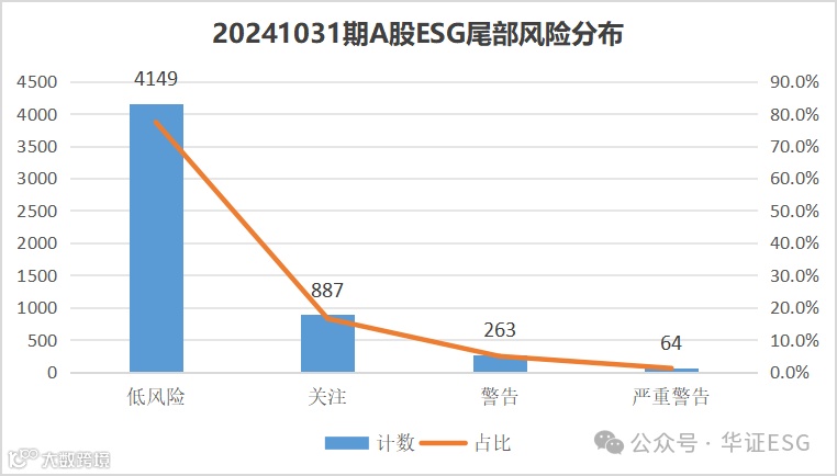 本期A股ESG评级尾部风险结果显示:被评为“低风险”的上市公司共有4,149家,占全部A股的77.4%;被评为“关注”的上市公司共有887家,占全部A股的16.5%;被评为“警告”和“严重警告”的上市公司共有327家,占全部A股的6.1%。