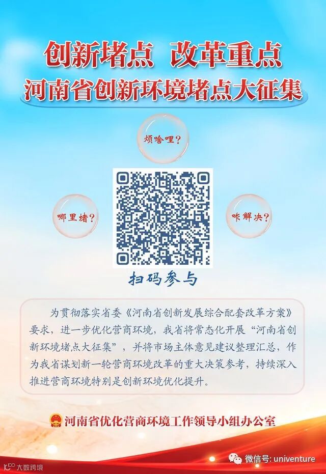 为贯彻落实省委《河南省创新发展综合配套改革方案》要求,进一步优化营商环境,我省将常态化开展“河南省创新环境堵点大征集”,并将市场主体意见建议整理汇总,作为我省谋划新一轮营商环境改革的重大决策参考,持续深入推进营商环境特别是创新环境优化提升。