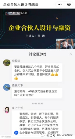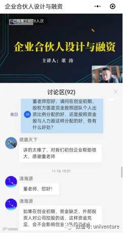 海外人才基地创业导师董涛以“企业合伙人设计与融资”主题进行了直播授课,重点围绕创业初期企业合伙的股权分类、股权激励机制及融资情况进行较为系统的授课,并穿插各类典型案例进行分析讲解,受到学员们的一致好评,很多学员在直播过程中与主讲导师深入交流,并提出疑问,董涛导师都一一回答。