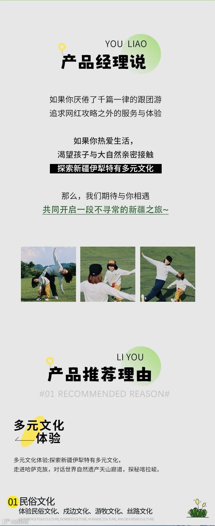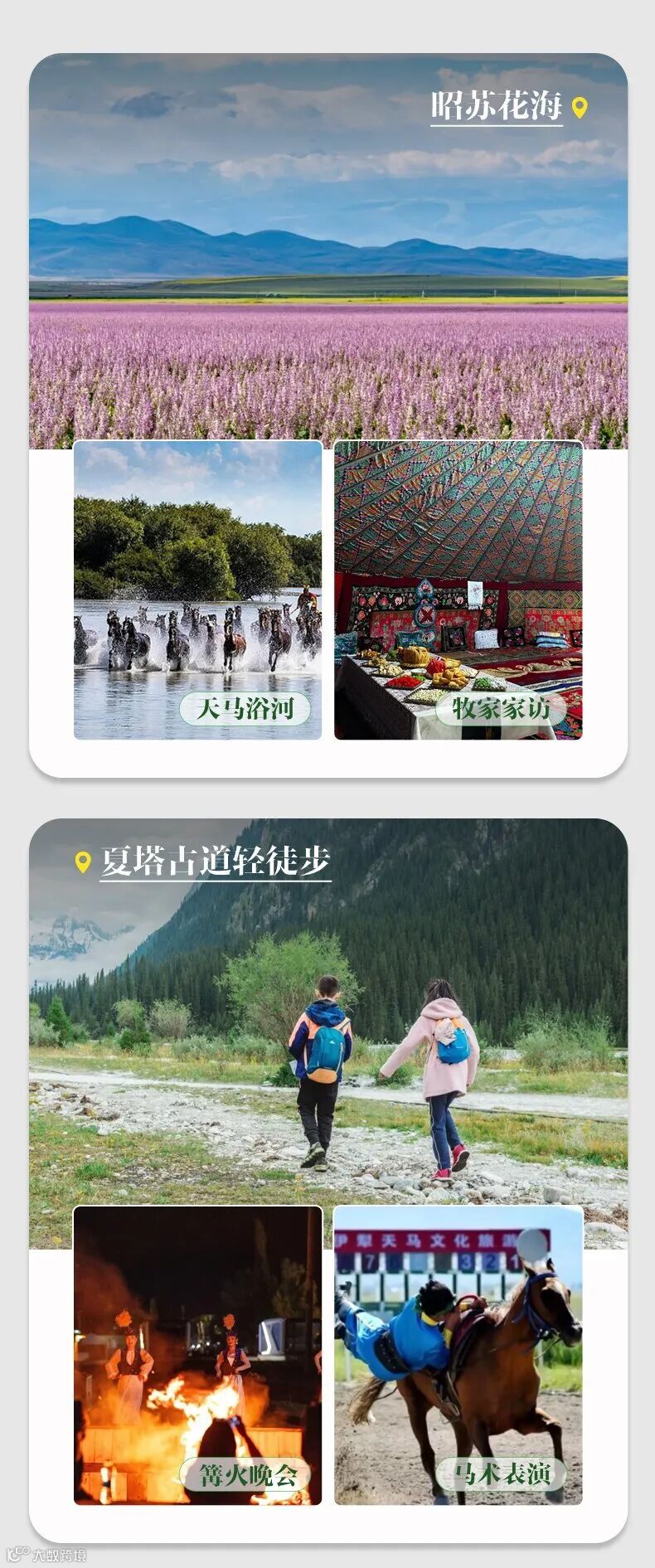 定制产品涉及全疆大小景区景点,在大众的景区中增加小众景观,合理规划体验项目(情侣出行、亲子活动、宿舍出游、家庭度假)
