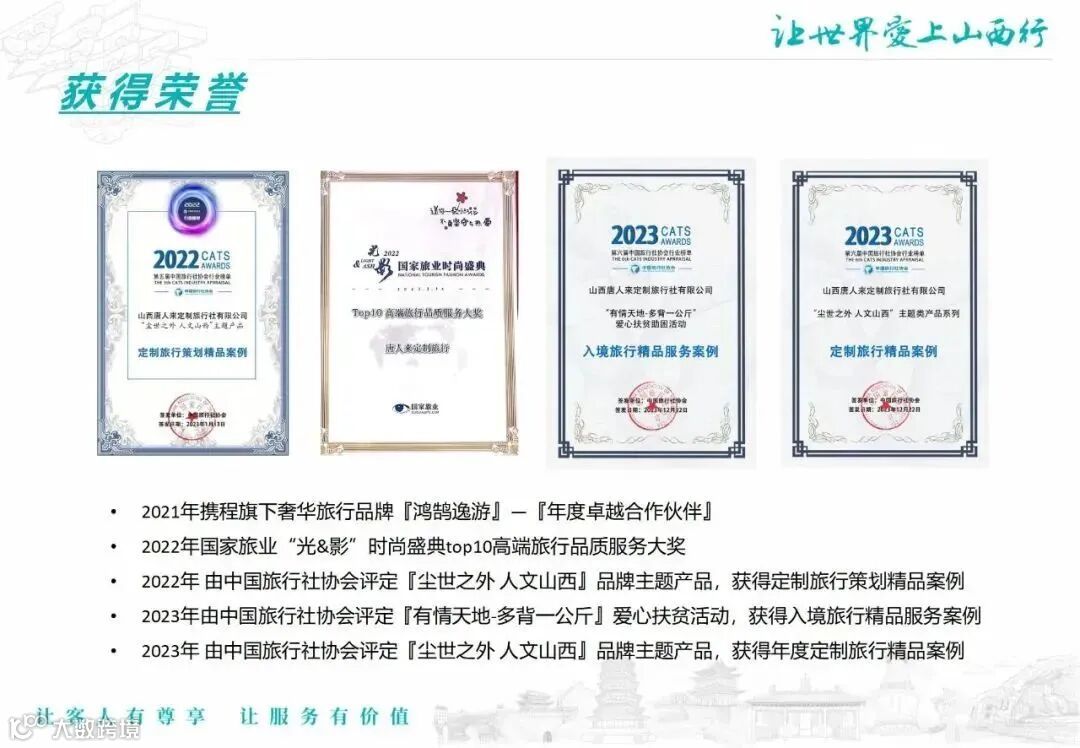 2023年 由中国旅行社协会评定『尘世之外 人文山西』品牌主题产品,获得年度定制旅行精品案例