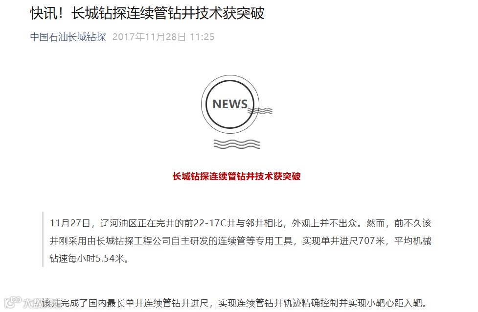 ▲2017年11月28日推文:连续管钻井技术刷新了当时国内最长单井进尺纪录