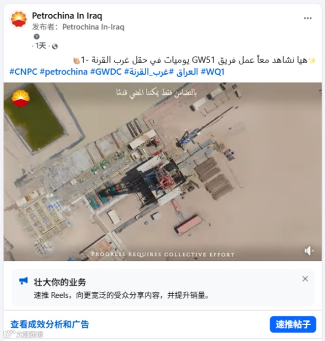 中国石油(伊拉克)Facebook、X、Ins、TikTok账号发布《西古长城钻探GW51队混剪》图文及视频,总浏览量3.6万。