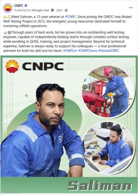 《长城钻探 优秀测试工程师Saliman》等五期帖文,反映了中国石油重视人才培养、文化互鉴和员工福祉的鲜明特色,彰显了企业以人为本、共赢发展的责任担当,总浏览量307万。