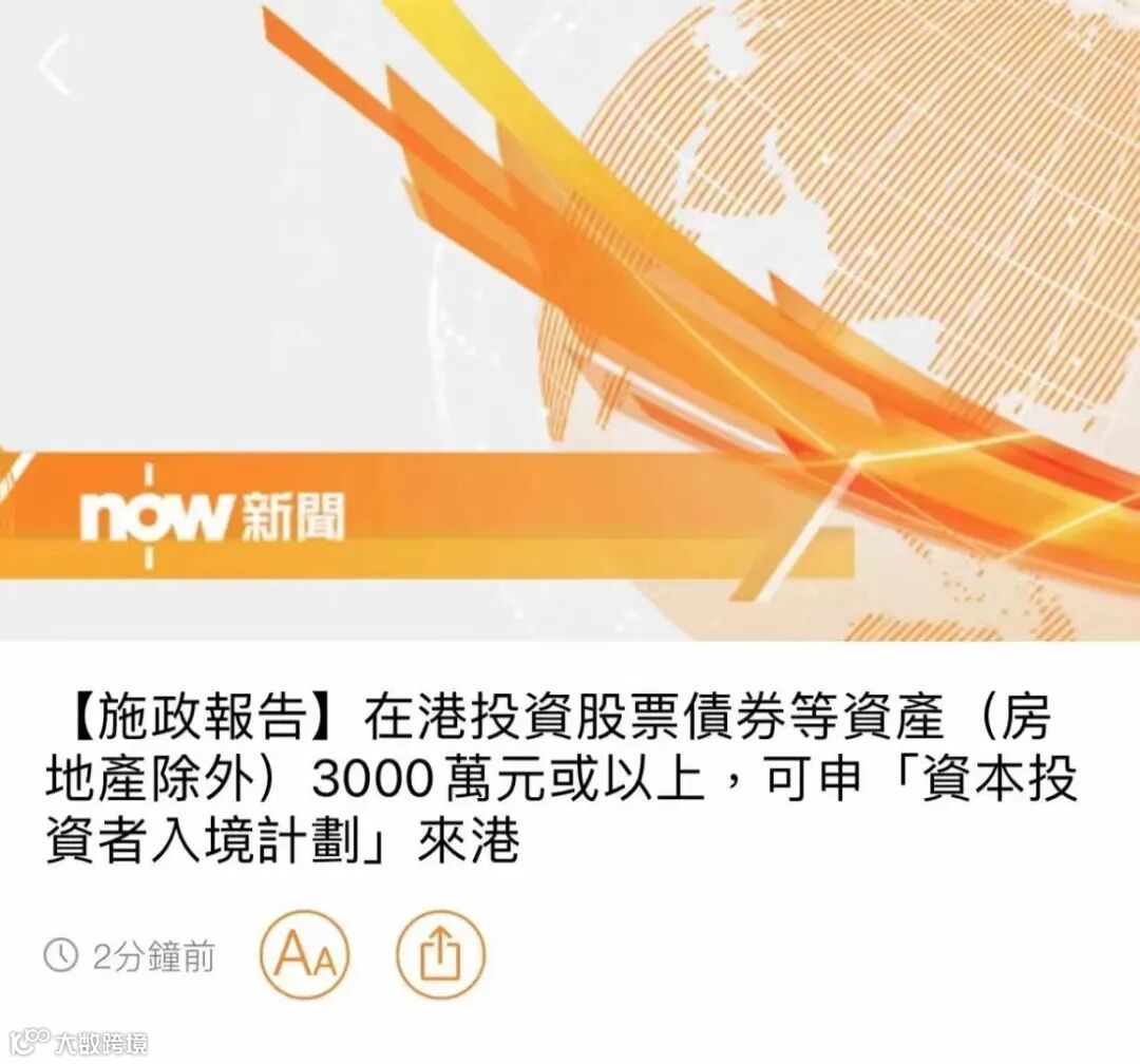施政报告显示,在香港投资股票、基金、债券等资产(房地产除外)3,000万元或以上的合资格投资者,可以通过计划申请来港,细节今年内公布!