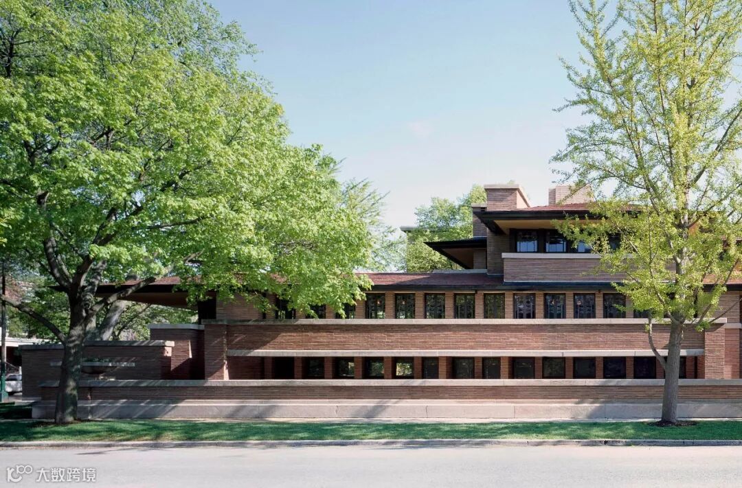 罗比住宅强调支配性而沿地平面水平展开的开放式平面,呼应了美国中西部大草原的水平线条;设计语言集中体现了草原住宅的精华:低坡屋顶、深远的挑檐、格外醒目的水平线条、明确的公共私人领域分隔和以壁炉为核心的自由平面。