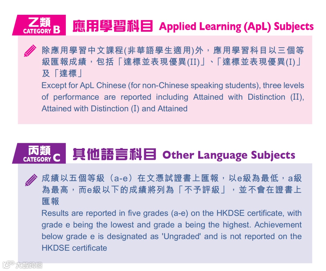 DSE考试成绩以登记方式呈现,学生成绩从低到高分为1、2、3、4、5、5*、5**七个等级,1个等级计作1分,5**等级则可以计7分,单科满分7分。