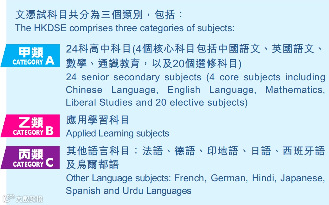 甲类(A):24科高中科目(4个核心科目包括中文、英文、数学、通识教育,以及20个选修科目)