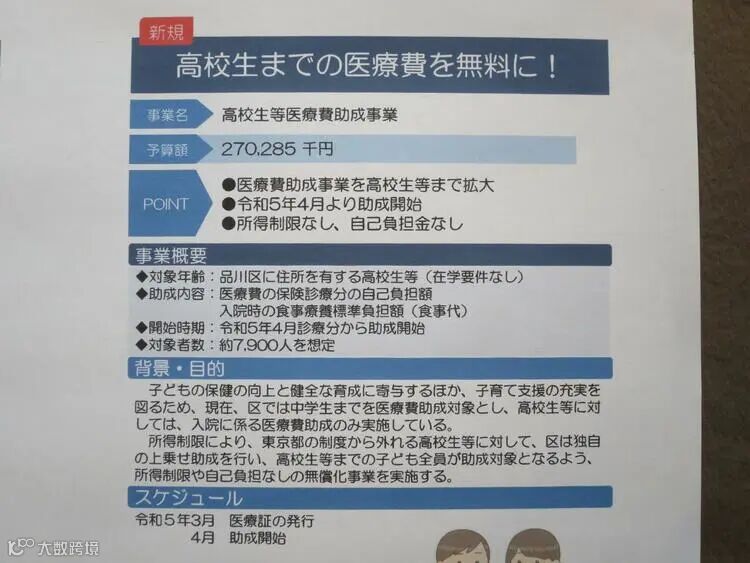 首先根据日本现行的国家医保制度,在日本长期生活的人从出生开始到小学入学之前只用负担医疗费的20%,上小学开始一直到70岁自己负担医疗费比率为30%(70-74岁为20%,75岁以上为10%),而实际上由于各地方政府都有自己的补助制度,在日本出生的小朋友包括外国小孩到初中毕业为止的医疗费都是全额免除的,近些年来为了鼓励年轻人多生孩子,日本很多地区甚至把这种免费医疗的补助制度延伸到了高中毕业为止。