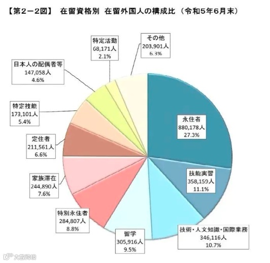 在日外国人中,人数最多的在留资格为“永住者”,比2022年底增加1.9%,达88.0178万人。之后依次为“技能实习”增加10.2%至35.8159万人,以工程师或财会负责人等身份工作的“技术、人文知识与国际业务”增加10.9%至34.6116万人。为了应对劳动力不足,2019年引进的“特定技能”人数达17.3101万人,比2022年底增加32.2%。
