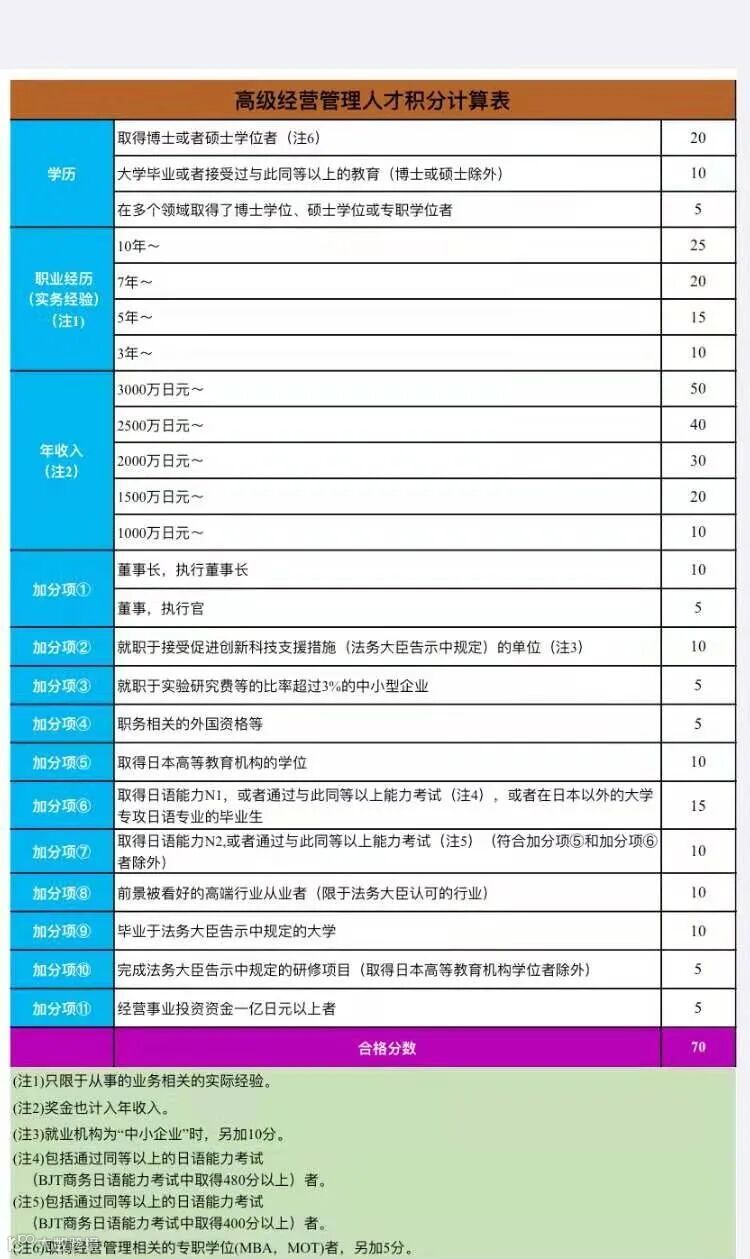通过高度人才打分表,评分在70分以上,就可认定为高度人才,申请永住所需的在日居住年数就缩短为3年;