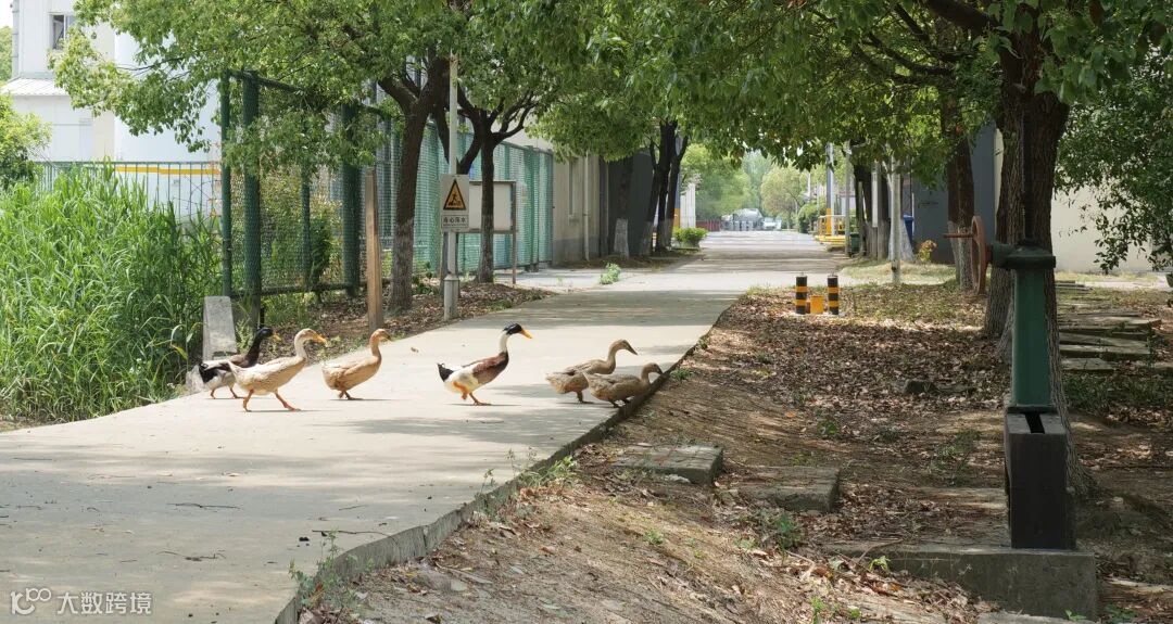 站在内河岸边,只见碧波荡漾的河道上成群的小鸭正优雅嬉戏,不时有白鹭等野生鸟滑翔水面,毛茸茸的雏鹅成群结对在岸边啄着杂草,即将在厂区内开启“职业生涯”。