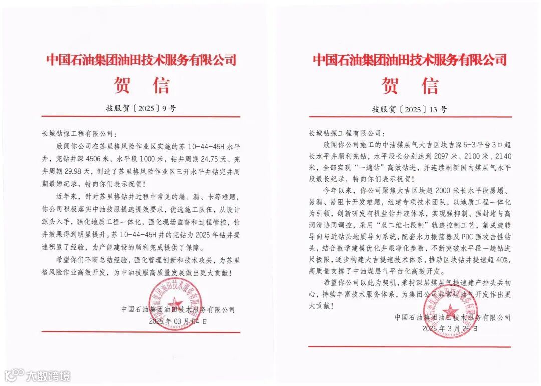 近日,钻井一公司广大员工状态顶格,两级部门气象更新。长庆项目部施工的苏-X井以29.98天的钻完井周期打破苏里格风险作业三开水平井钻完井周期最短纪录,这是长城钻探进入苏里格开发20年来首次将三开水平井周期降至30天内;山西煤层气项目部高效完成中油煤公司部署的首座水平段超2000米的深层煤岩气水平井平台,推动长水平段煤岩气井提速取得新突破;四川页岩气项目部连刷威远自营区块二开单日进尺最高纪录。