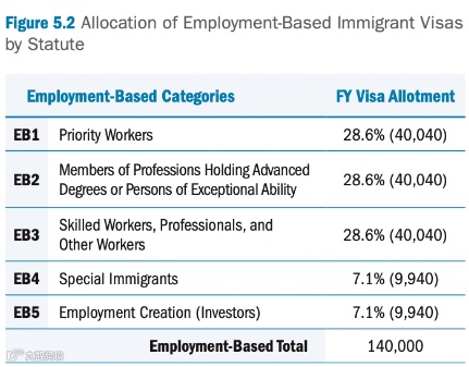 14万张职业移民绿卡也会也按照优先级分配优先级别,第一优先级别的EB-1、第二优先级别的EB-2、第三优先级别的EB-3每年分别有约4万张绿卡名额,EB-4和EB-5投资移民分别有约一万张绿卡名额。