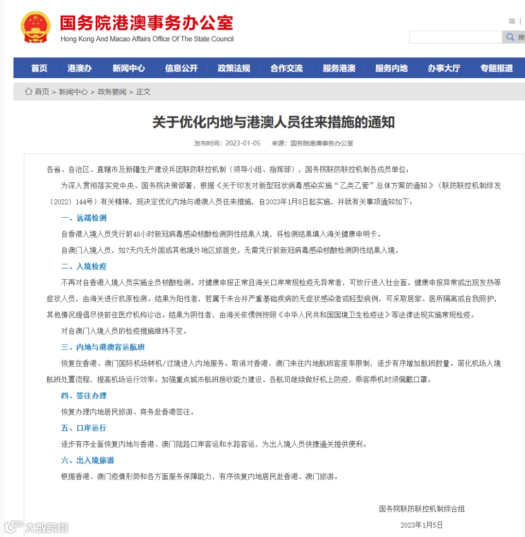 国务院港澳事务办公室发布《关于优化内地与港澳人员往来措施的通知》:1月8日起,将优化内地与港澳人员往来措施,有序恢复内地居民赴香港、澳门旅游。