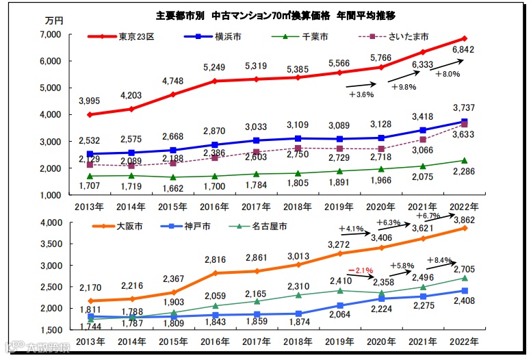 首都圈:东京23区涨幅为+8.0%,相对于供应户数少、成本高、销售价格进一步提高的新房,二手房更容易成为需求的载体。尤其是年末超过1亿日元的市中心,投资需求也很高,带动了东京23区的平均价格; -