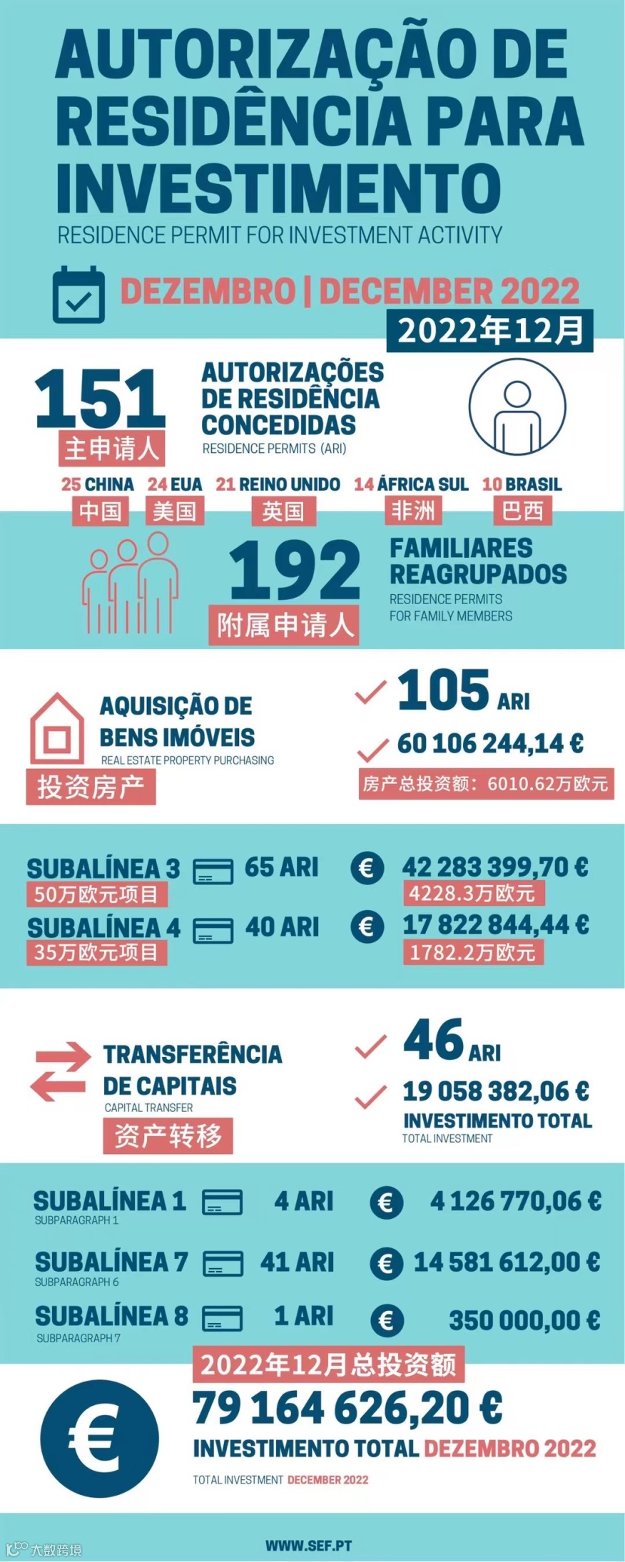 葡萄牙移民局(SEF)公布了黄金签证数据:2022年12月共计151位主申请人和192位附属申请人批获批葡萄牙黄金签证。其中,来自中国的主申请人为25人,在申请人国家中排在首位。其次是美国24人、英国21人、南非14人、巴西10人。