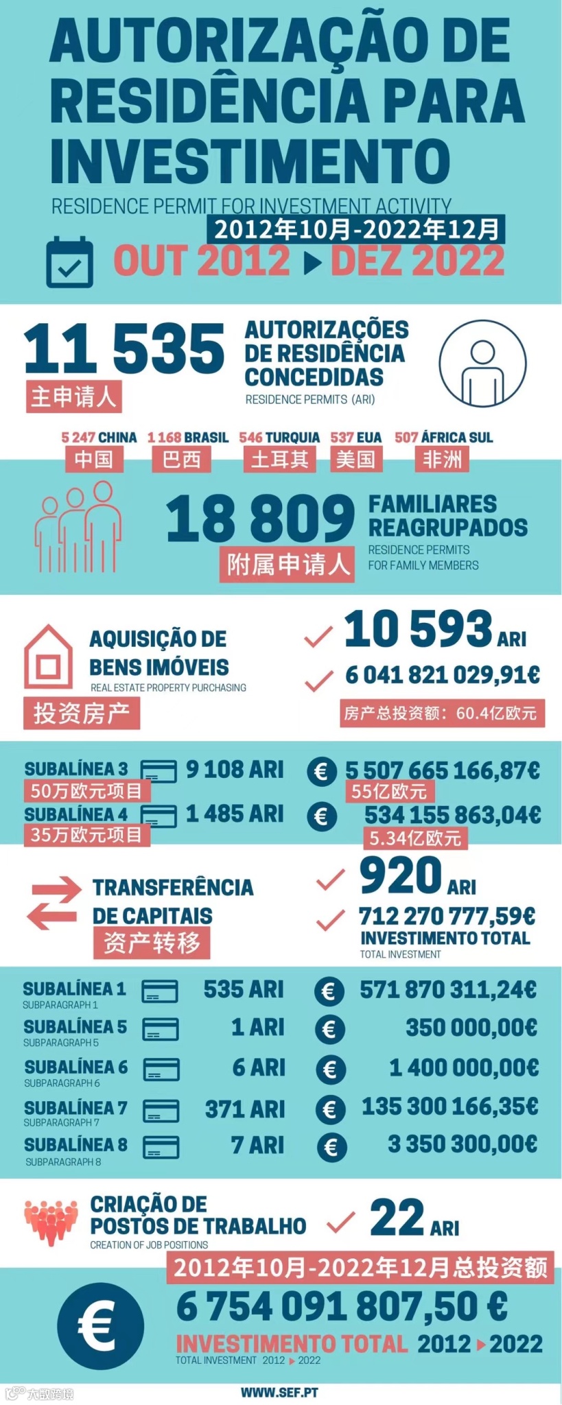 从2012年10月至2022年12月,葡萄牙黄金居留项目共获得67.54亿欧元的投资款。