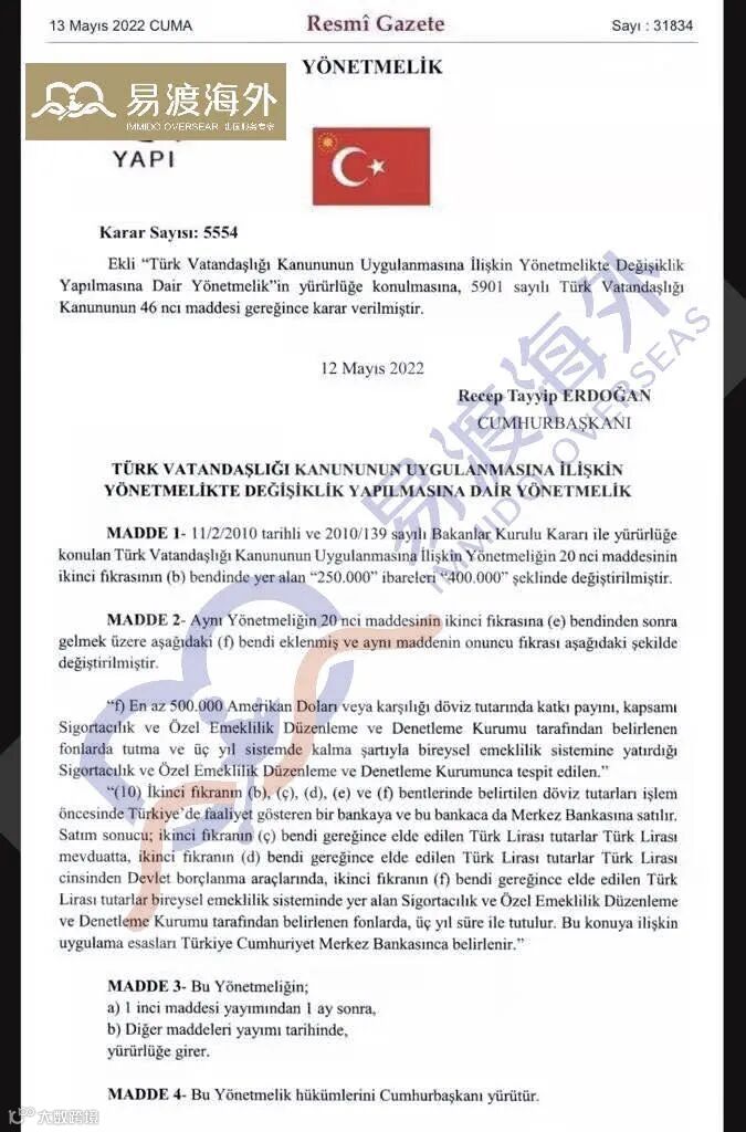 之前我们报道过土耳其购房入籍门槛将由25万提高至40万美元,今天传来正式消息——土耳其投资公民身份 (TCBI) 计划40万美金新政策生效时间为6月13日!旧政策6月12日截止!