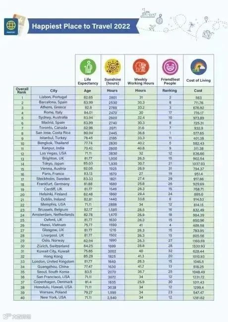 为了帮助游客做出这一艰难的选择,美国著名公司iVisa根据生活成本、阳光、绿地、友好的居民和预期寿命列出了世界上最幸福的城市,该排名包括来自世界各地国家的40个目的地。