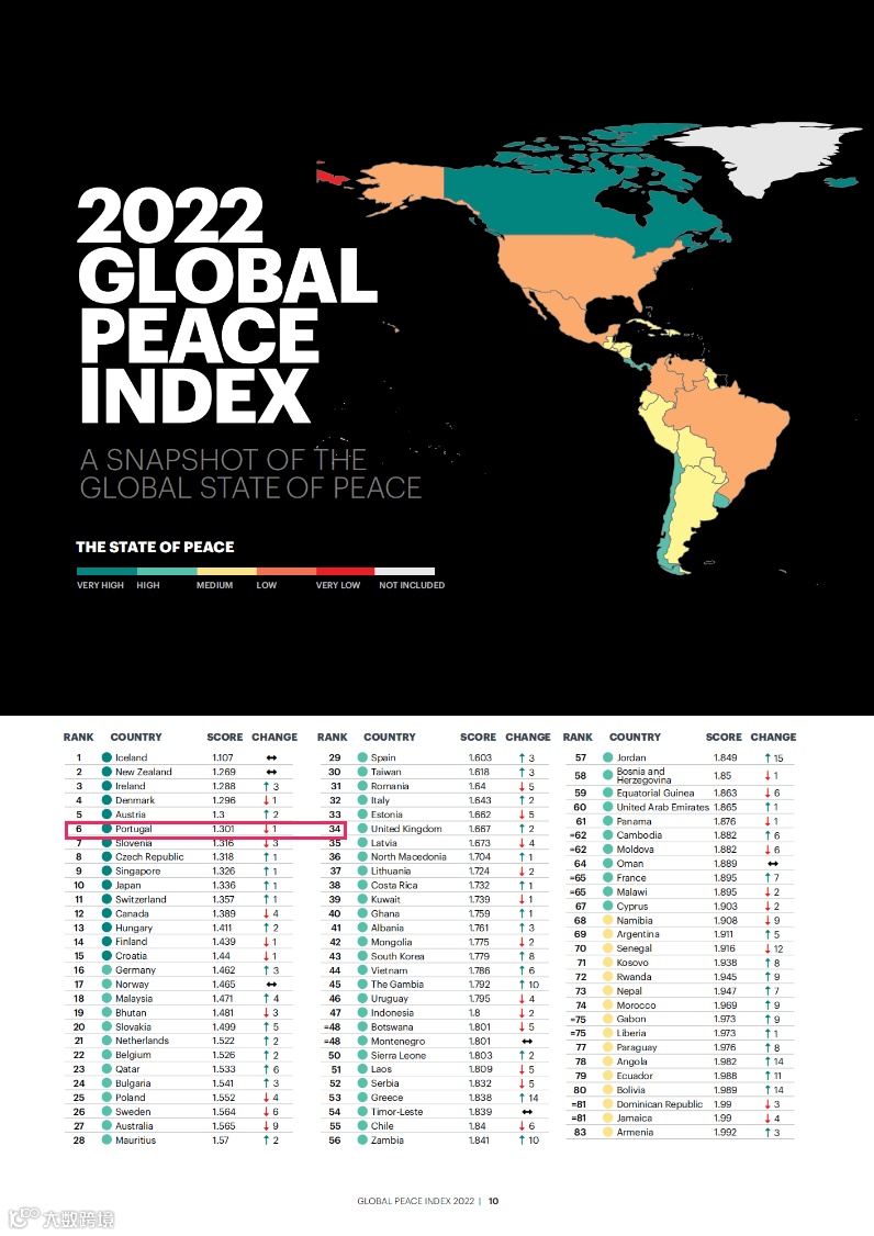 经济与和平研究所最新公布的全球和平指数报告,葡萄牙排名世界第六!