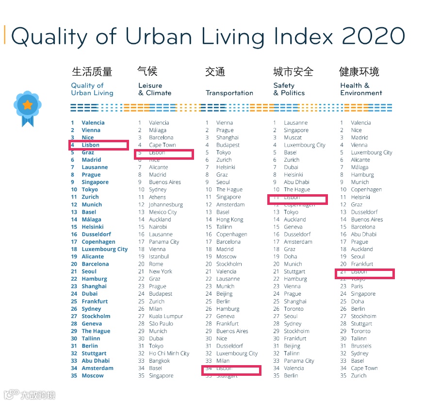 该排名从生活质量,气候,交通,城市安全,健康环境等多维分析,里斯本均榜上有名!